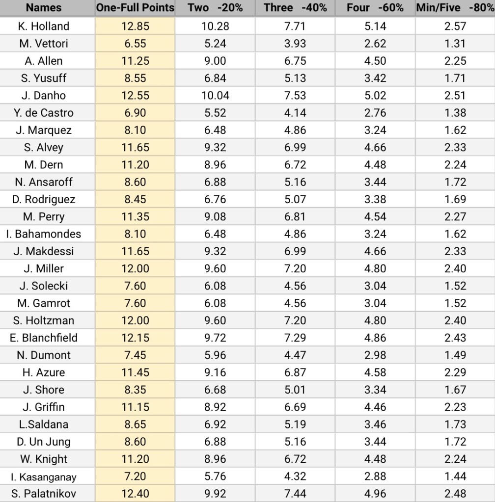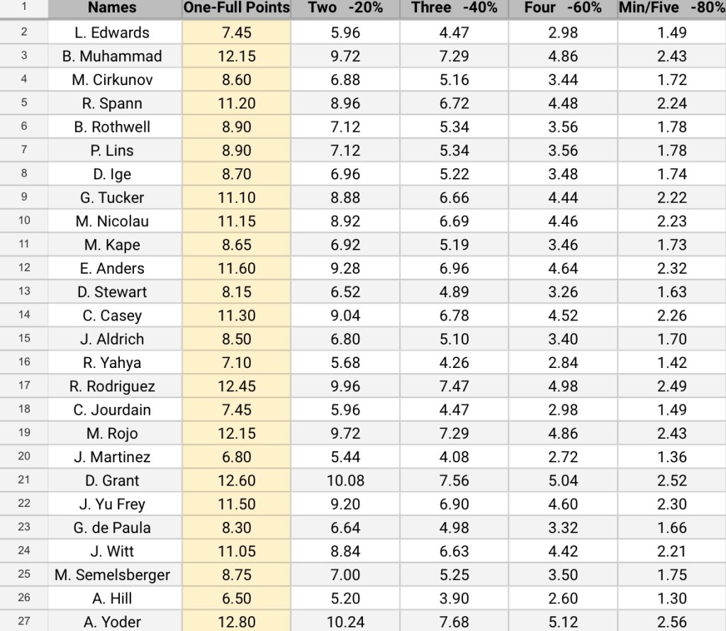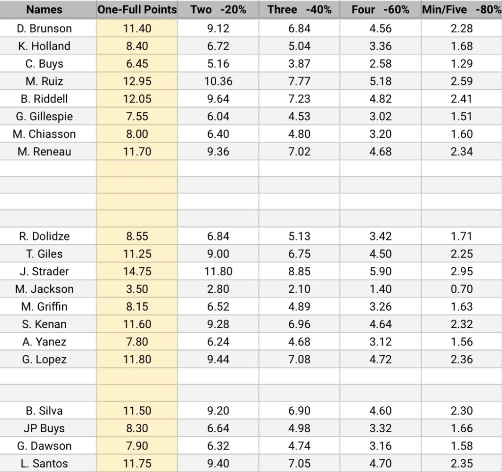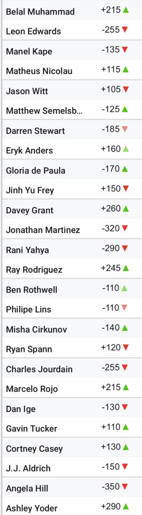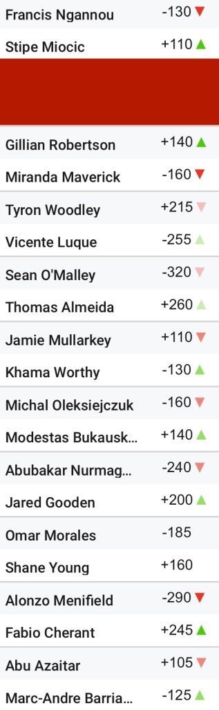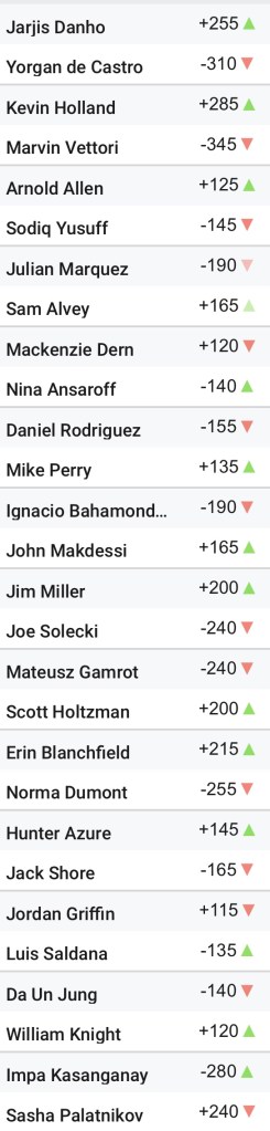 Below are the odds for this week and the potential points that can be earned for every fighter on the card based on where you slot them from 1 through 5.