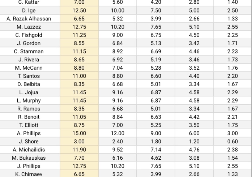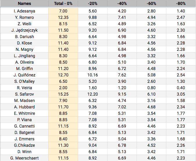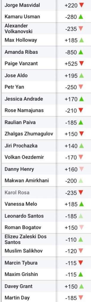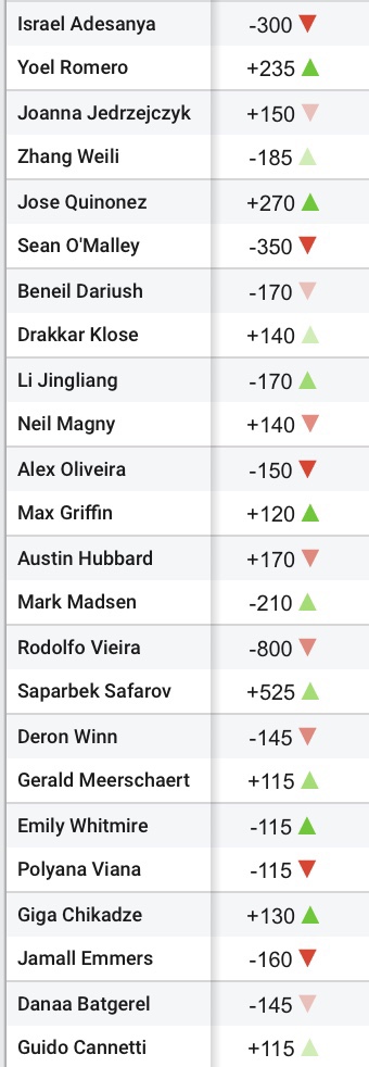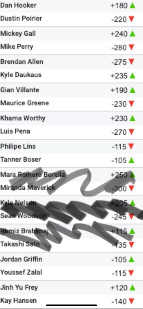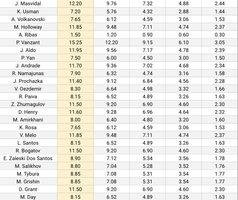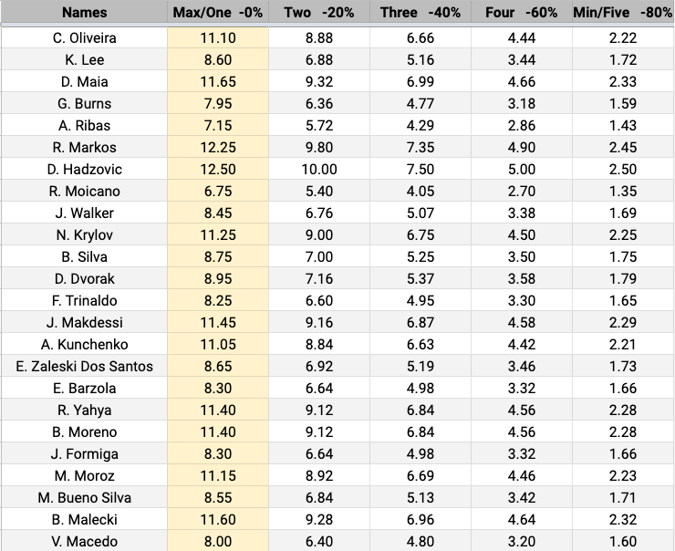 Below are the odds for this week and the potential points that can be earned for every fighter on the card based on where you slot them from 1 through 5.